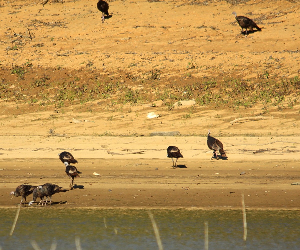 I notice some turkeys on the left shoreline as I cruised back toward Walters Bridge and the boat ramp. This water is extremely shallow and even the Gheenoe can not get close to the far shore. These birds are right down at the water line. I've never seen turkeys cast caution to the wind and linger in the open so long. It proves that humans haven't been able to intrude on their spaces.