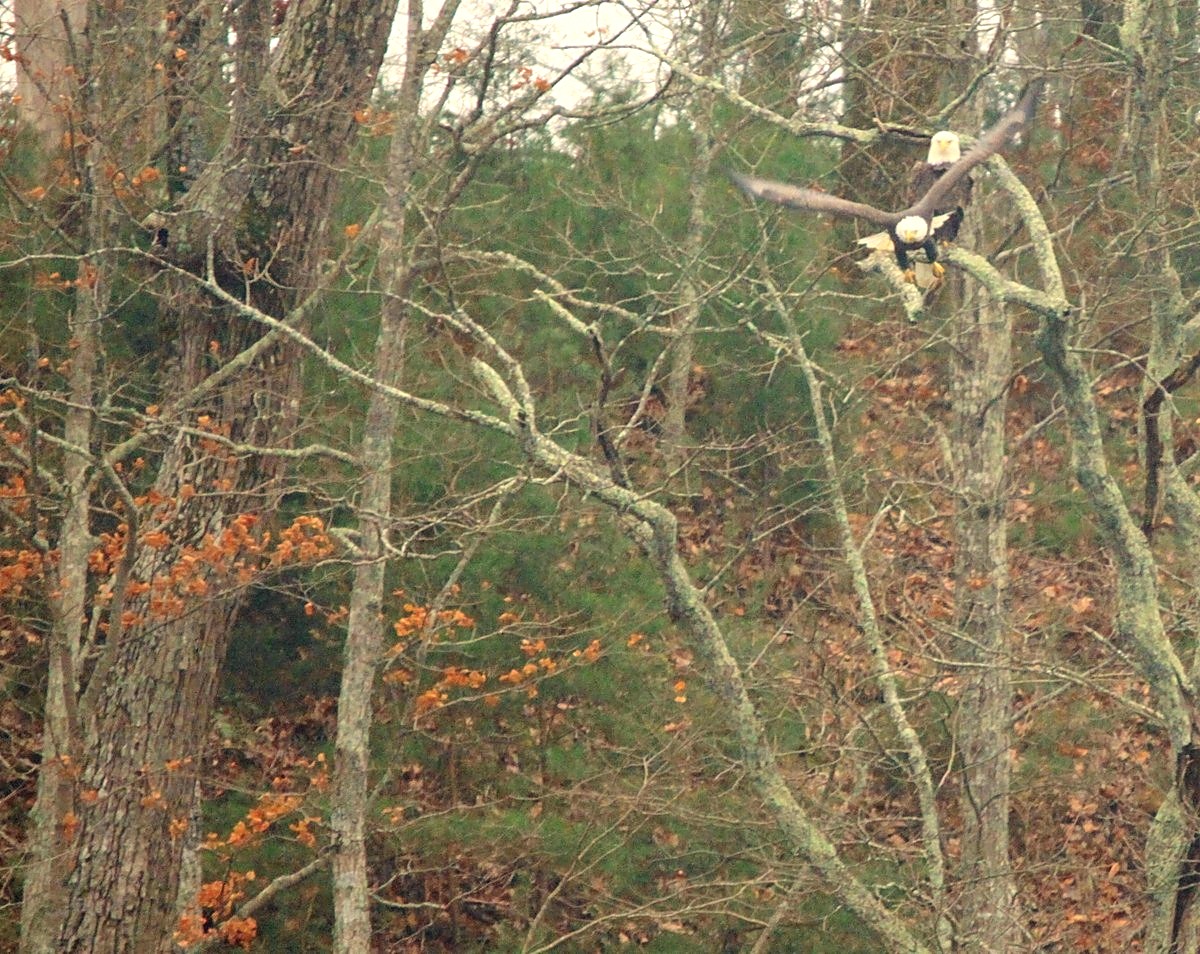 These eagles are frustrating me. They are always sitting on the highest limbs with the sun directly at their backs and in my face. I could have obtained some fantastic eagle shots this afternoon if the sun was at my back. Instead I got silhouetted shots that are of sorry quality. I was Johnny on the spot when an eagle would land on or take off from a limb. Look below. These could have been sensational eagle pictures.