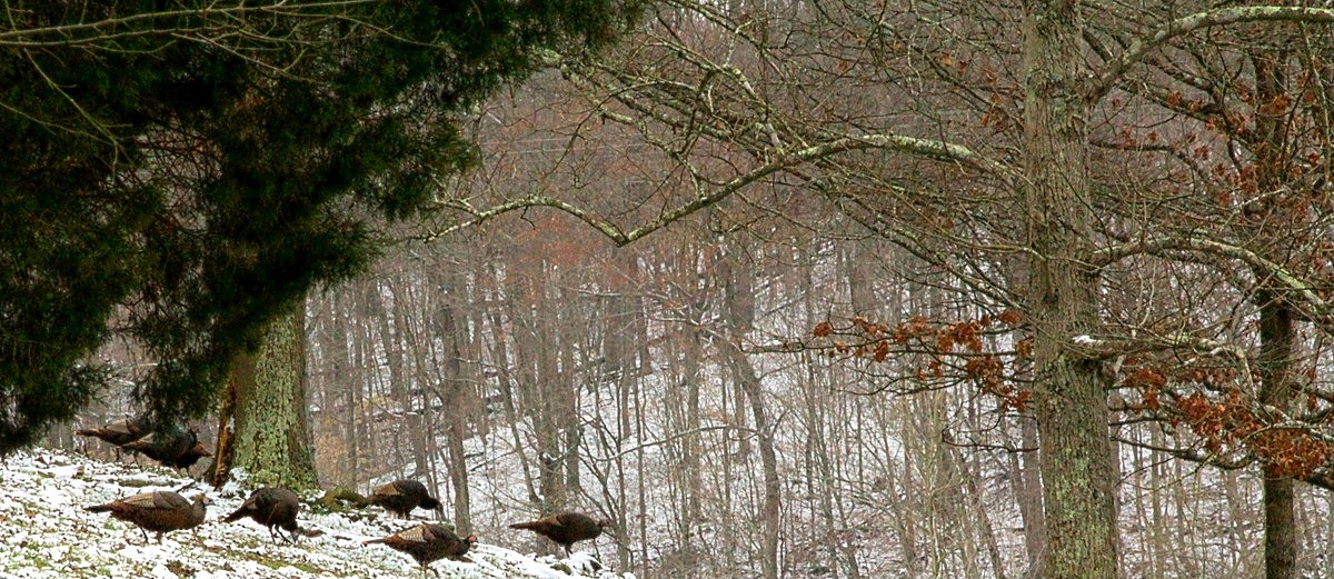 Turkeys are opportunistic creatures as far as finding food goes. They will eat insects, acorns, various nuts and seeds and the all important dry cattle feed that the farmer sets out for his cows.