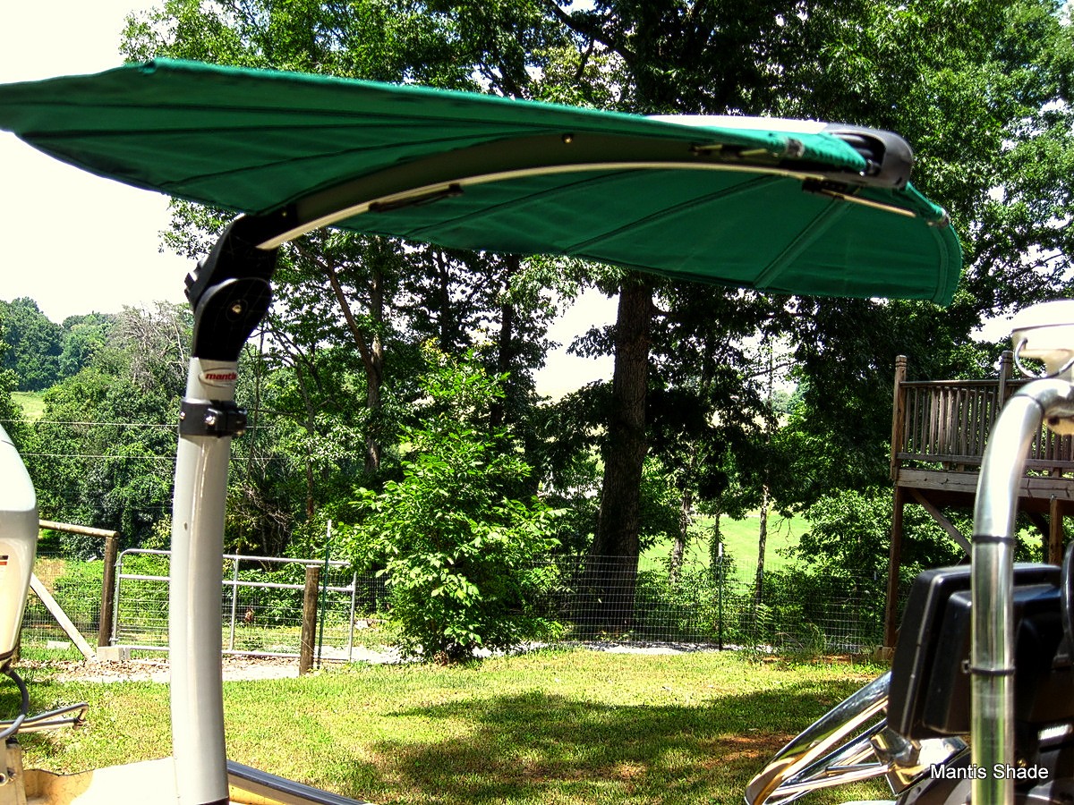 A lot of fishermen and animal watchers install regular umbrellas behind the seats on their boats and some buy umbrella installation kits that allow a more substantial umbrella install to the boats. The Mantis sun shade is a professional way of staying out of the sun and is effective as a shield against light, straight down rain.
