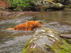This is a fast stream that takes advantage of the momentum it accumulates as it rushes down the very steep mountain. The velocity of its flow is paused occasionally by flat areas that form pools that collect and hold the water. They overflow and the water continues flowing down and into the next pool, wherever it may be. No other term accept spectacular will suffice for description. Douglas and I followed up along the stream and were welcomed by pool after pool of cold, clean mountain water. The golden one took advantage of each pool.